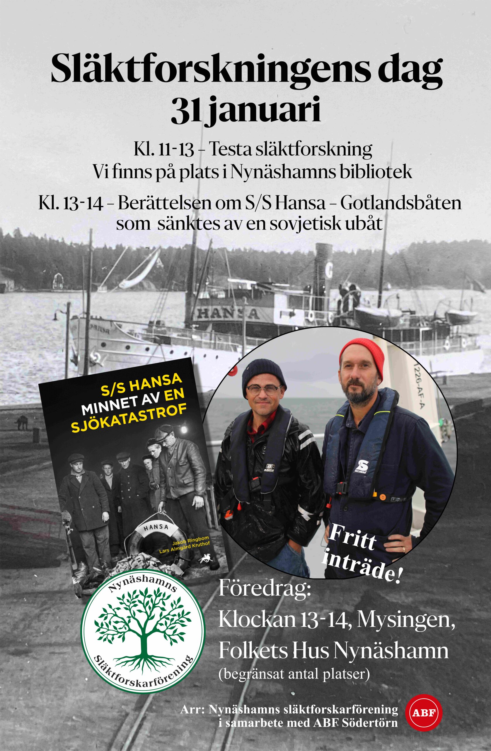 Välkomna! På Släktforskningens dag bjuder vi på en intressant föreläsning om Hansakatastrofen. Jakob Ringbom och Lars Almgård Kruthof berättar om vad som hände den där råkalla novembernatten 1944, och om hur de har arbetat med sina efterforskningar.